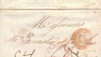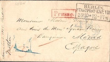 Die Taxen hier kenne ich auch nicht, aber der Empfänger musste 1 Gulden 12 Kreuzer bezahlen. Ich meine dass Briefe von Spanien nach Deutschland über Frankreich Franko spanisch-französische Grenze abgeschickt waren. Somit war die Taxen 54 Kreuzer für Frankreich und 20 Kreuzer für Bayern. Kann es richtig sein?