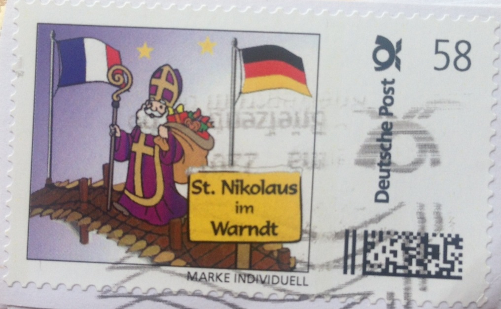 St. Nikolaus im Warndt, Abbildung: Nikolaus auf einer Holzbrücke, an den Enden Flagge von Deutschland und Frankreich 58