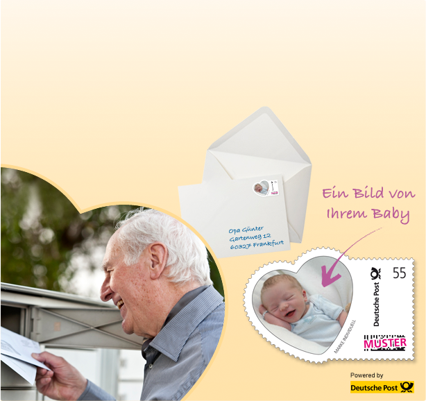 Jetzt habe ich eine Seite der Post gefunden, in dem Aktionsbriefmarken angeboten werden. Neben zwei herzförmigen Marken auch vier Fußballspieler mit einigen „Auswüchsen“ auf der linken Seite der Marke. Diese Marken sind also so zu kaufen, man kann sie wohl auch mit eigenen individuellen Motiven ausfüllen, so wie die Babys im Herz: