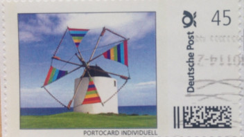 Abbildung: Windmühle mit regenbogenfarbenen Blättern, auf Wiese, im Hintergrund Wasser 45
