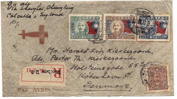 Hier meine erste Frage. Es handelt sich um einen eingeschriebenen Brief aus Canton via Harbin und Sibirien nach Kopenhagen. Die Marken sind mti dem Stempel "Canton 26.11.25" entwertet. Hier wurde also die europäische Jahreszahl verwendet. Rückseitig Transitstempel "Harbin 9.12.25" und Ankunftstempel "Kopenhagen K 25.12.25" Laufzeit insgesamt 29 Tage. Offenbar war selbst aus dem südchinesischen