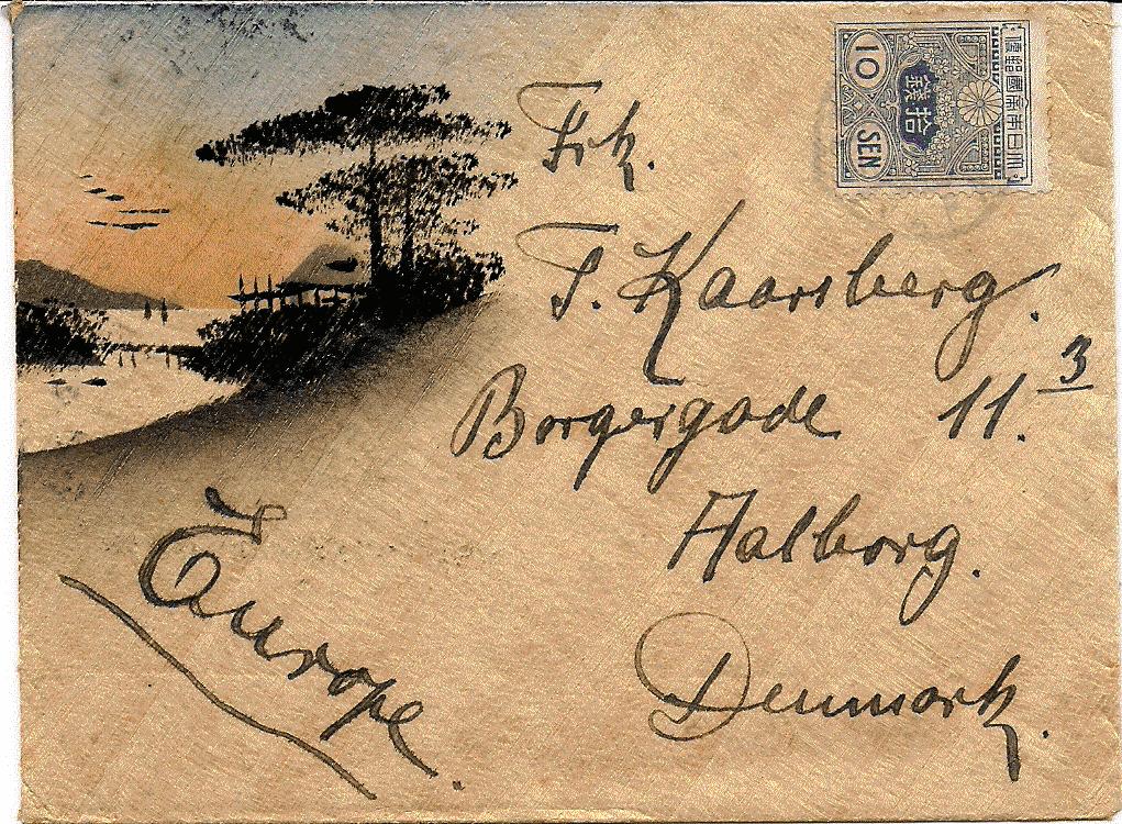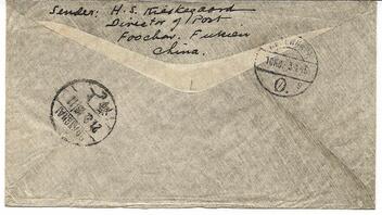 Hier meine erste Frage. Es handelt sich um einen eingeschriebenen Brief aus Canton via Harbin und Sibirien nach Kopenhagen. Die Marken sind mti dem Stempel "Canton 26.11.25" entwertet. Hier wurde also die europäische Jahreszahl verwendet. Rückseitig Transitstempel "Harbin 9.12.25" und Ankunftstempel "Kopenhagen K 25.12.25" Laufzeit insgesamt 29 Tage. Offenbar war selbst aus dem südchinesischen