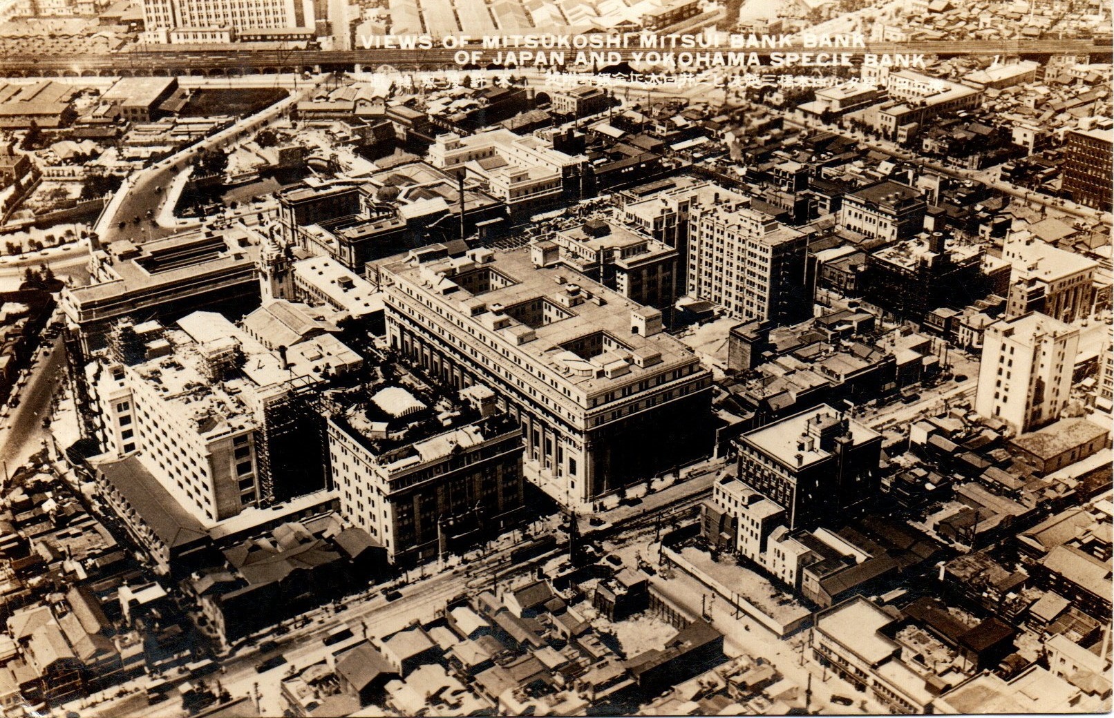 Beschreibung: Views of Mitsokoshi Mitsui Bank, Bank of Japan and Yokohama Specie Bank, Die Bank of Japan ist das relativ bescheidene Gebäude in der Mitte oben mit den zwei Flügeln und der Kuppel über dem Eingangsbereich.