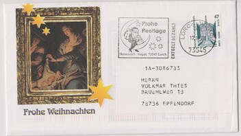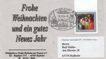 Brief aus dem Jahre 2004 mit hübschem Weihnachtsgruss in Form einer Weihnachtsmarke 2004, entwertet mit passendem Werbestempel vom "Odenwälder Weihnachtsmarkt" in MICHELSTADT am 4. Advent.