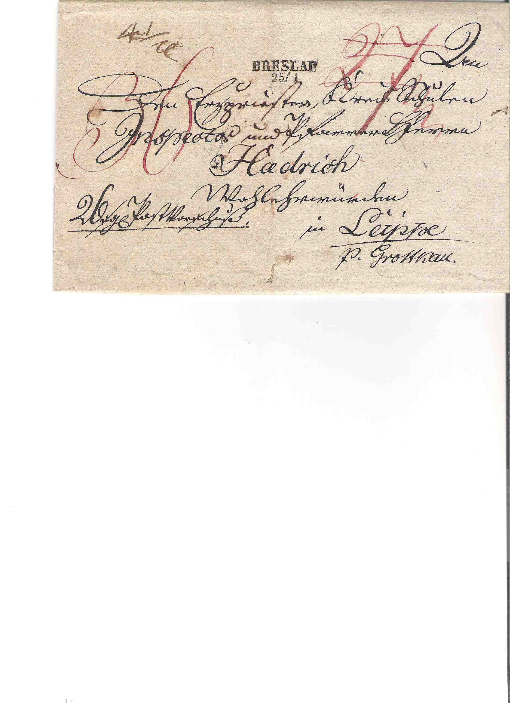 Der Brief ging an den Erzpriester und Inspector Hadrich in Leippe Post Grottkau (heute polnisch Grodkow, schlesisch Gruttke). Den gab es dort wirklich, im Internet kann man nur wenig über ihn finden, ein Brief in lateinisch mit Übersetzung von 1839 ist aber dort noch abgebildet):