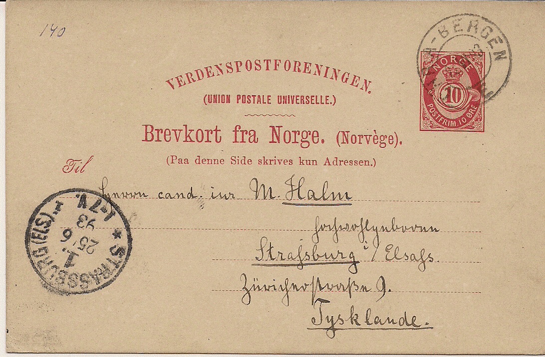 heute zeige ich eine 5 Öre Ganzsachenpostkarte (Inlandspostkartenporto), die im Jahr 1890 von Kongsberg nach Christiania geschickt wurde.