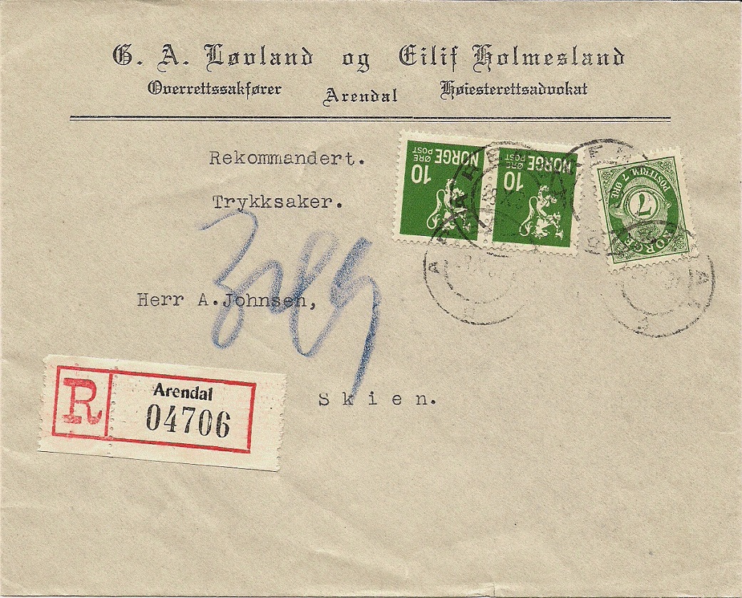 hier der erste von ein paar Belegen zur Posthorn-Ausgabe 1920/1929. Es handelt sich um eine Inlandsdrucksache, die per Einschreiben am 28.10.31 von Arendal nach Skien verschickt wurde.