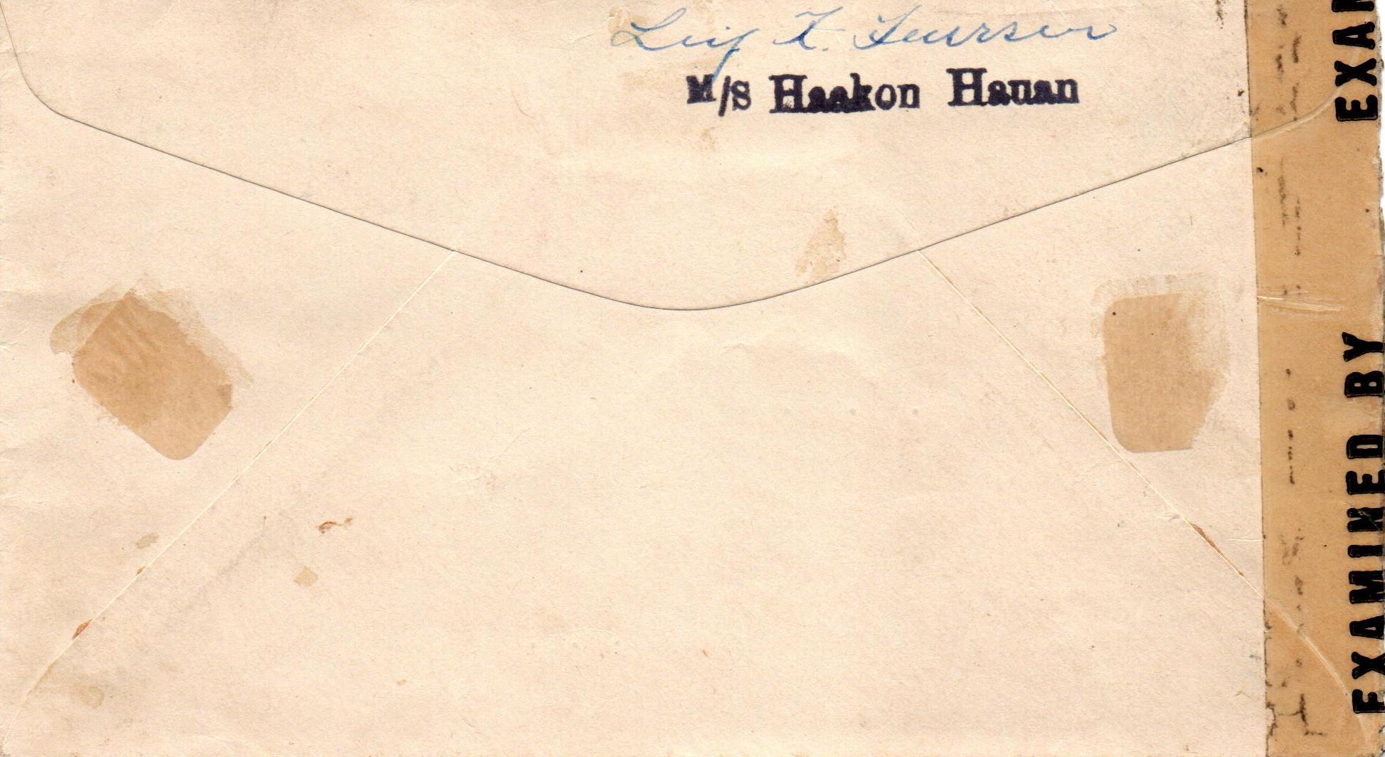 Hier ein filatelistischer Brief mit den höheren Werten frankiert vom norwegischen Tanker MS Haakon Hauen vom 20. Juni 1944 nach Dinuba in Kalifornien/USA. Die Marken wurden mit dem Rahmenstempel "20. Juni 1944/Norsk Skipspost/Handelsflåten" entwertet.