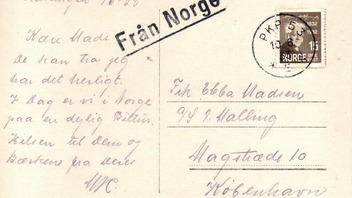 Bislang hatte ich keinen Beleg mit einer Marke dieser Ausgabe. Hier nun eine in Gratangen (Helgeland) geschriebene Ansichtskarte nach Kopenhagen. Im Text nicht erwähnt handelte es sich unter Umständen um einen dänischen Touristen an Bord eines Hurtigruten-Dampfers der die Karte dann in Narvik in den Bahnpostbriefkasten eingeworfen hat. Schwedischer Bahnpoststempel PKP 53 10.6.33. Außerdem der schwedische Linienstempel "Fran Norge"