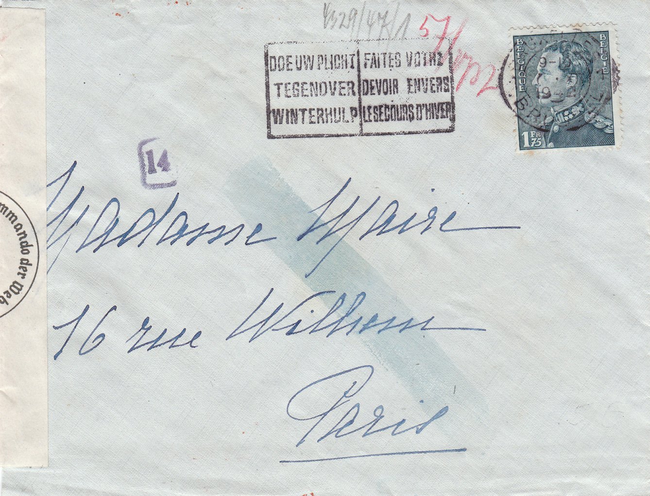 Brief aus Belgien aus dem Jahre 1942, gelaufen über die für die Untersuchung des Briefverkehrs mit Belgien zuständige Auslandsbriefprüfstelle Köln, dort linksseitig geöffnet und per Verschlußzettel wieder verschlossen, was rückseitig mittels zwei Abschlägen des Handprüfstempels "C 62" dokumentiert wurde.