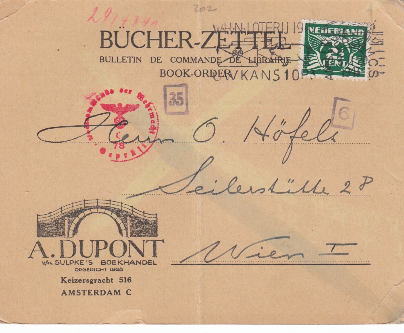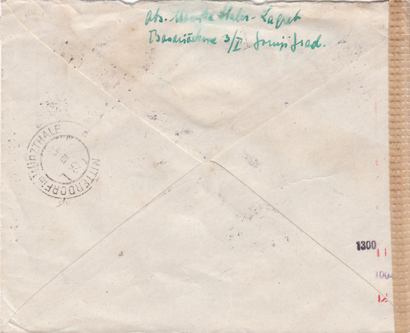 Anschließend lief der Beleg durch die Auslandsbriefprüfstelle Wien, was per rotem Handprüfstempel Riemer G-3a, Landsmann GP1.4, 43 mm hoch, Kreis 35 mm Durchmesser, Schwingen des Adlers zeigen links auf zweites "m", rechts auf "W", unten Kreuz, Abstand "O" bis "t" 9 mm, dokumentiert wurde.