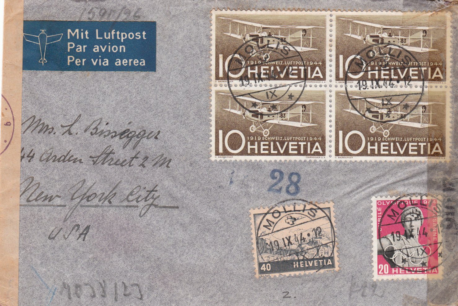 Dieser Brief aus der Schweiz in die USA per Luftpost wurde am 19.09.1944 in MOLLIS aufgegeben und der Auslandsbriefprüfstelle Berlin zugeführt.