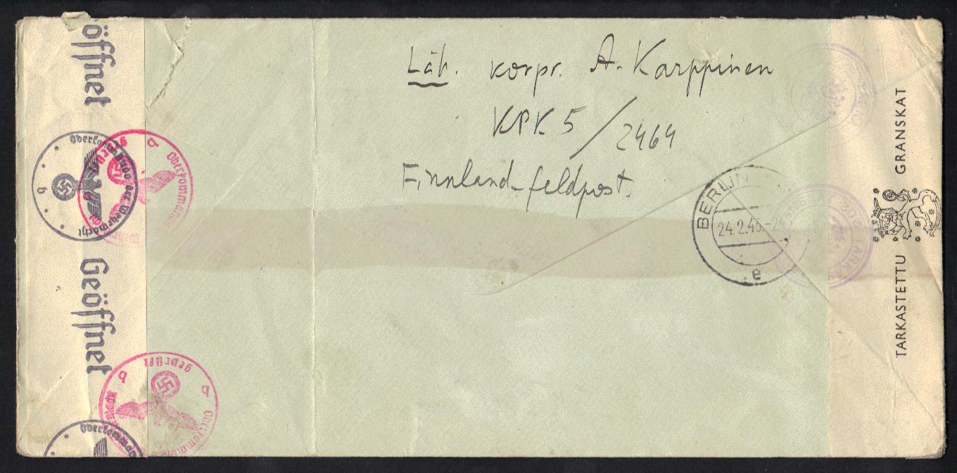 In Deutschland angekommen wurde die Karte in der Auslandsbriefprüfstelle Berlin untersucht, was ein handschriftlicher Vermerk des Prüfers "3607" sowie ein Handprüfstempel Riemer B-6 dokumentieren. Dieser Stempel mit weit herumgezogenen Schwingen des Adlers, die links auf "0", rechts auf "rm" der Umschrift zeigen ist relativ selten, denn er wurde lediglich von Juli bis September 1944 verwendet und kam in dieser Zeit meistens, wie auch in diesem Falle, auf Kriegsgefangenenpost zum Einsatz.