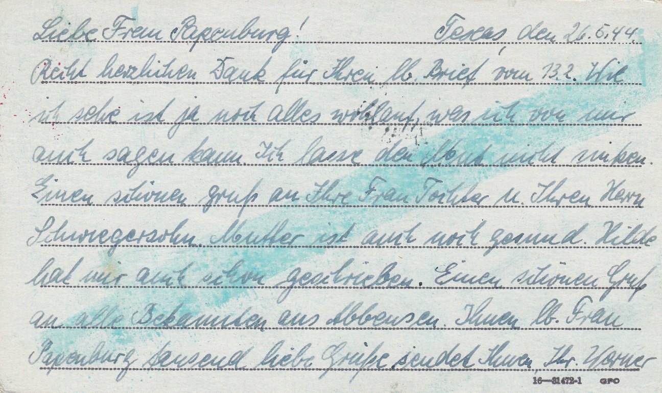 Am "26.5.44" in "Texas" schrieb "Wachtmeister Werner Haupt" als Absender diese Karte auf einem entsprechenden Vordruck mit Druckvermerk "November 1, 1942".
