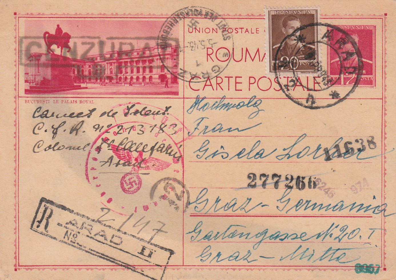 Diese am 17.04.1943 von zwei verschiedenen Absendern beschriebene rumänische Bildpostkarte, adressiert nach "Graz - Germania", wurde per Einschreiben am 18.04.1943 in ARAD 2 in Rumanien aufgegeben und lief durch die rumänische Zensur, wo ein schwarzer Stempel "CENZURAT / 9" sowie ein schwarzer Kreisstempel "92" abgeschlagen wurden. Dem Absender "C.f.R. No. 213183 / Colonel" nach handelt es sich um Post aus einem rumänischen Gefangenenlager.