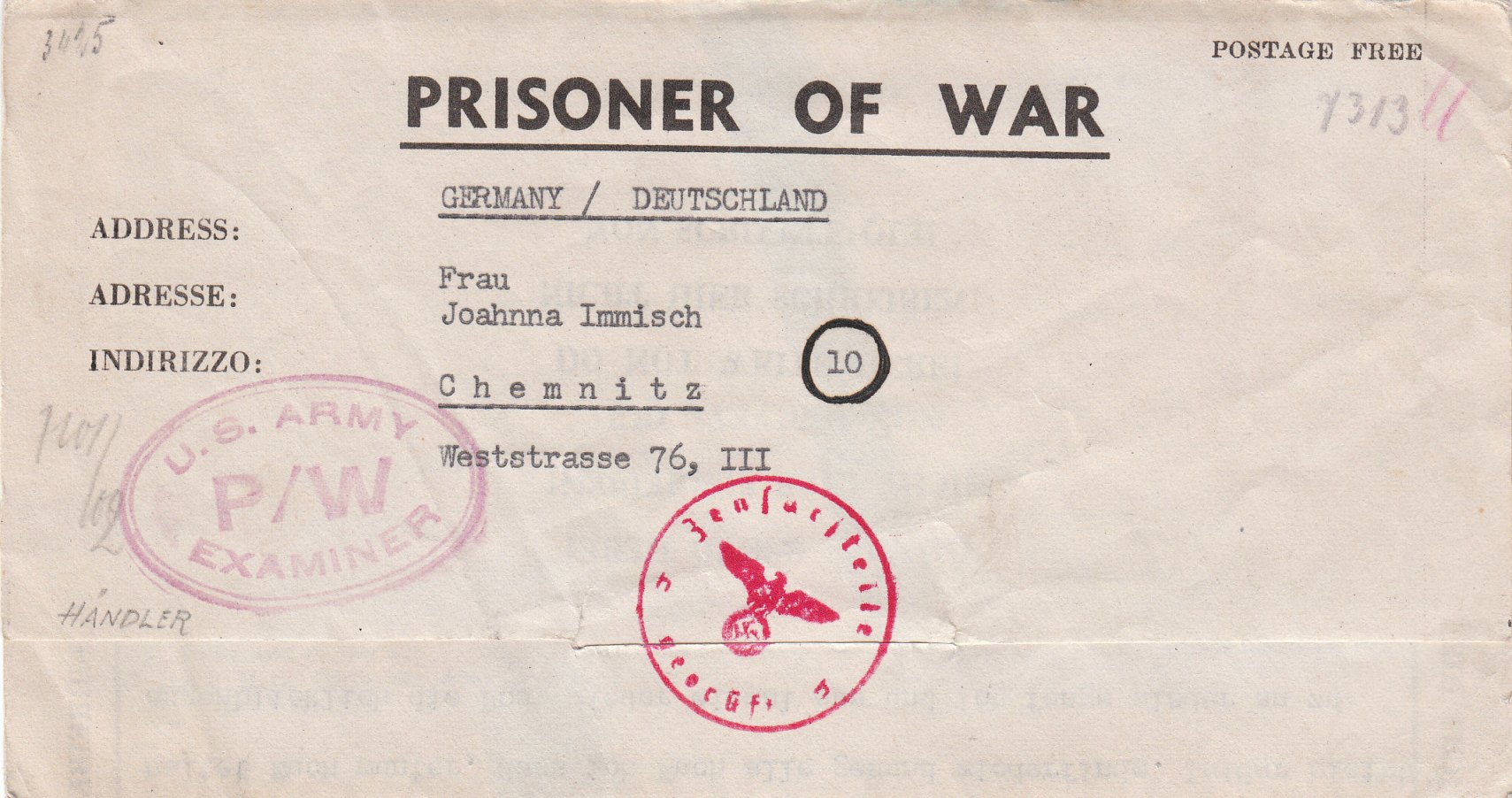 This is one of the scarcer censor office using the code "n" for identification. Riemer only listed 3 handstamps for this office.