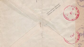 Der Brief wurde dort linksseitig geöffnet und per Banderole Landsmann DV4.1 "Zensurstelle / d", Druck violett, Papier grau, wieder verschlossen, was per Handprüfstempel "Geprüft / Zensurstelle" mit zwei Punkten, links unter der Schwinge, rechts in Höhe der Schwinge, dokumentiert wurde.