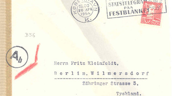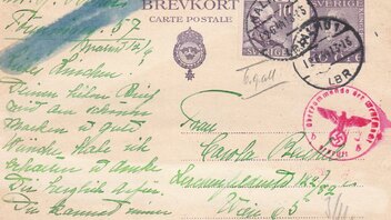 Postkarte mit Zusatzfrankatur aus Ungarn mit Tagesstempel 13.02.1941 entwertet, gelaufen über die ABP Wien, wo ein Maschinenprüfstempel in rot, Landsmann GPM1.2, mit vier gleich langen Linien sowie Schrift in Antiqua abgeschlagen wurde.