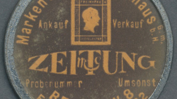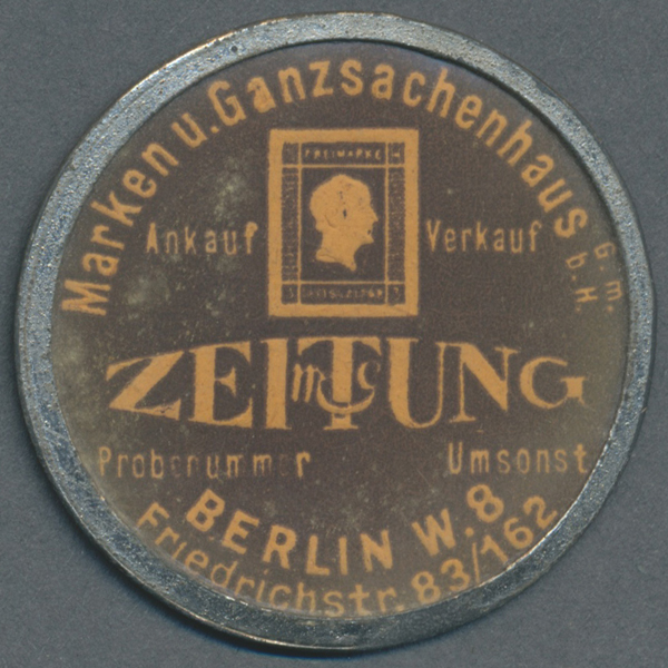 Ein interessantes Kapselgeld vom Marken- und Ganzsachenhaus Berlin GmbH in der Friedrichstr. 83 mit Abbildung einer Briefmarke (Preussen 3 Silbergroschen Michel-Nr. 8 oder 12?). Beim Auktionshaus Gärtner wurden dafür 55,- EUR bezahlt.