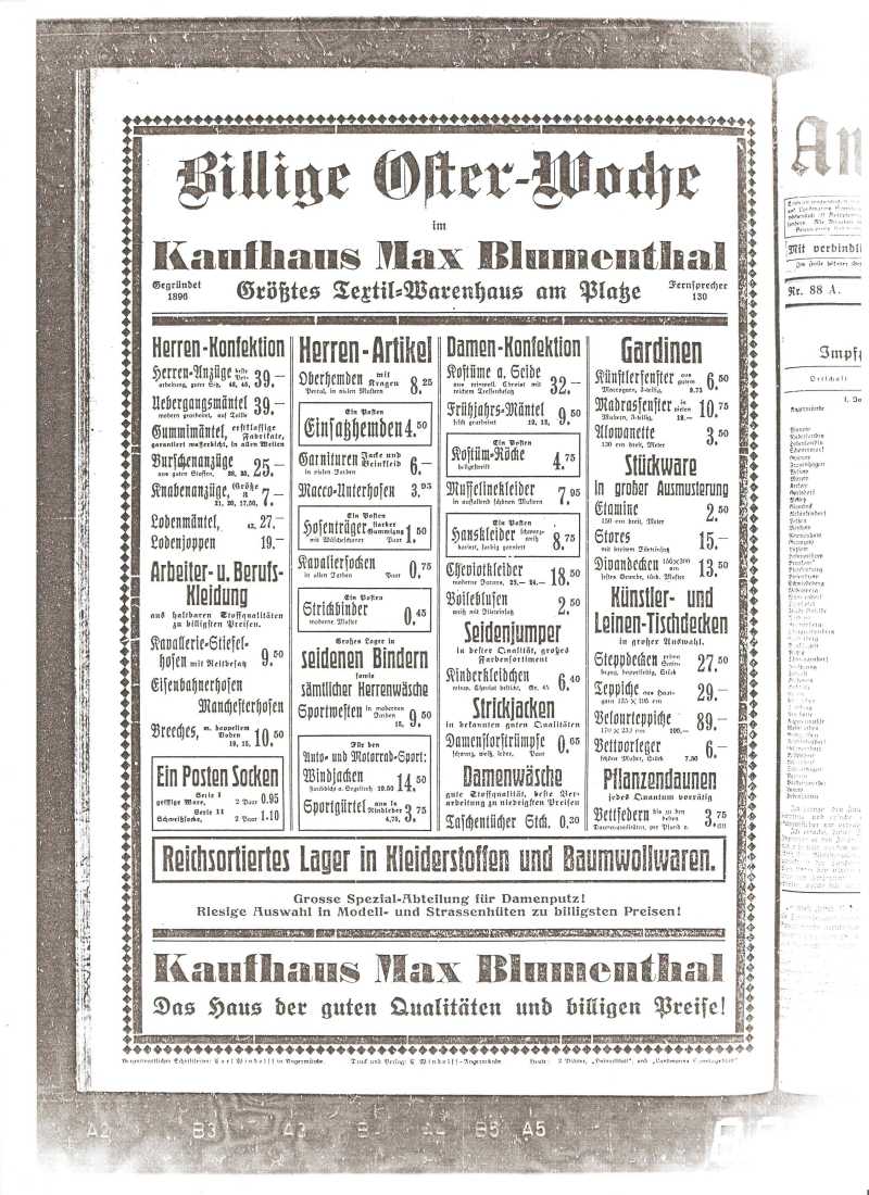 Ganzseitige Anzeige des Kaufhauses Max Blumenthal aus der Angermünder Zeitung vom Sonnabend, den 12. April 1927.