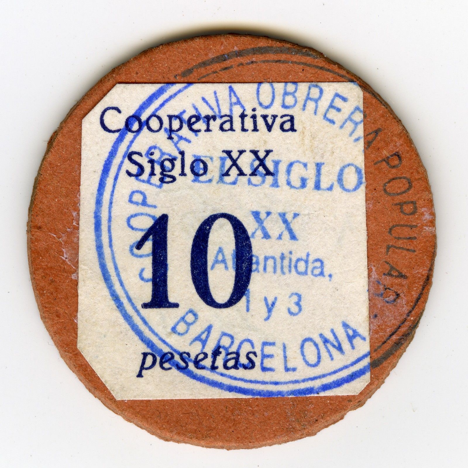 Dieses seltsame Ding aus Spanien wird vom spanischen Verkäufer als "Kapselgeld" zu 17,50 EUR im Sofortkauf angeboten. Auf dem runden Karton sieht man aber keine Briefmarke wie üblich beim Kapselgeld, sondern nur ein Stück aufgeklebtes weißes Papier mit dem Aufdruck: Cooperativa Siglo XX (Arbeitergenossenschaft Jahrhundert) und dem Nennwert 10 Pesetas. Alles abgeschlagen mit einem blauen Stempel aus Barcelona. Für mich ist das vielleicht eine Art von Notgeld-Münze, aber kein Kapselgeld, bei dem die Briefmarke unter Zelluloid eingeschlossen ist: