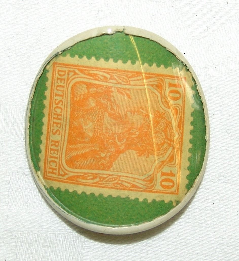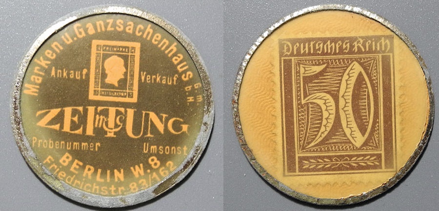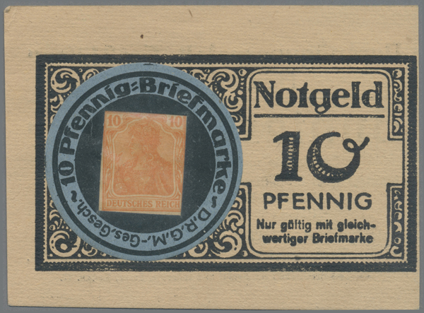 Außer münzenähnlichem Kapselgeld wurden früher auch Notgeldscheine mit einer eingeschlossenen Briefmarke (hier die Germania) verausgabt: