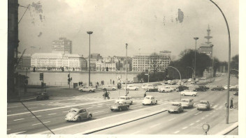 Glockengießerwall – Blick aus Richtung Kunsthalle auf die Binnenalster, den auf ihrer Westseite liegenden Neuen Jungfernstieg und eine Reihe markanter Bauwerke (v.l.n.r.): Hotel Vierjahreszeiten, Unilever-Haus, Esso-Haus, Finnlandhaus (), Heinrich-Hertz-Turm (ugs. auch Telemichel) mit noch nicht vollendeter Spitze. Auf der Aufnahme fehlt noch der Neubau der Berenberg-Bank. Die Karte wurde 1968 per Post versandt, deshalb sind Spuren von Stempelfarbe auf der Bildseite.