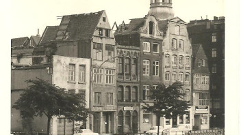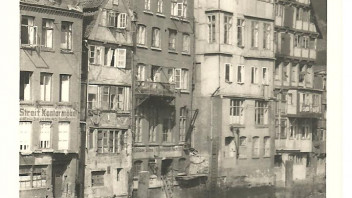 Bei den Mühren – die Dachgeschosse der historischen Kaufmannshäuser sind in baufälligem Zustand und die Häuser sind wohl später der Spitzhacke zum Opfer gefallen, im Hintergrund die Hauptkirche St. Katharinen.