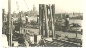 Elbe – Schlepper, im rechten Hintergrund sieht man die Ende der 1960er Jahre demontierten Helgen der ehemaligen Stülcken-Werft