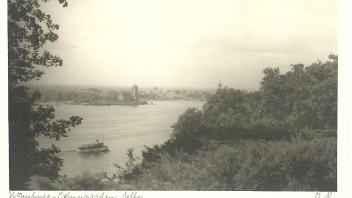 Teufelsbrück – Blick Richtung Innenstadt, im Vordergrund eine Hafenfähre