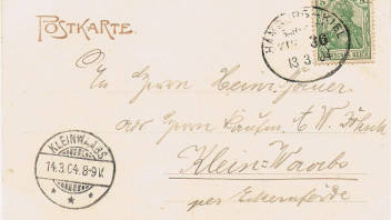 Die Karte ist nach Klein-Waabs gelaufen und dort am 14.3.04 angekommen. Klein-Waabs liegt auf der Halbinsel Schwansen an der Ostseeküste so in etwa auf halber Strecke zwischen Eckernförde und Damp. Laut Handbuch von 1896 bestand in Klein-Waabs eine Postagentur.