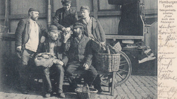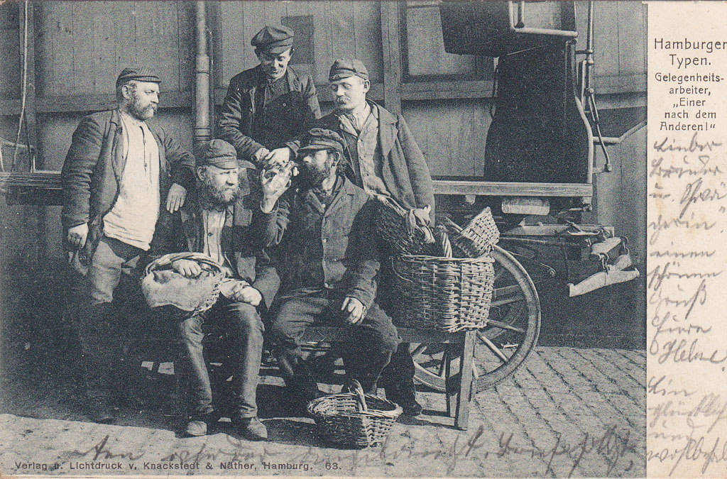 Nicolai-Fleet – das Nikolaifleet war der ursprüngliche Mündungsarm der Alster und Keimzelle des Hamburger Hafens. Auf der Aufnahme ist sichtbar, wie das Fleet dem Tidenhub der Elbe ausgesetzt ist – eine Schute liegt auf dem Trockenen. Die auf der Karte abgebildeten Häuser konnten durch Initiative eines 1972 gegründeten Vereins erhalten werden. Eine Ansicht der sanierten Häuser aus der entgegengesetzten Richtung bietet ein Photo auf Wikipedia: Der Verein hat eine Ansicht der Häuserzeile in den Header seiner Website integriert: