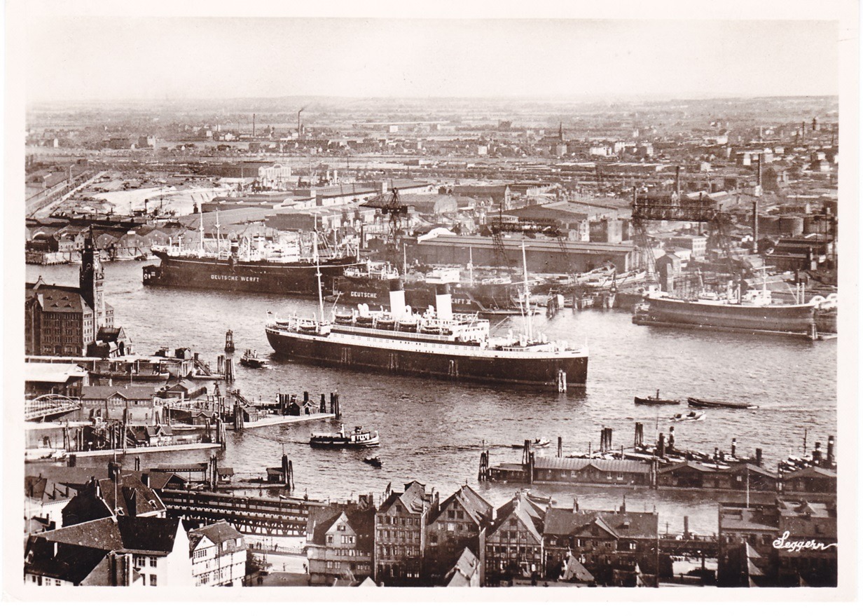 ein sehr schöne Karte mit einem Passagierschiff der Monte-Klasse der Hamburg-Süd als Hingucker. Leider ist der Schiffsname auf dem Scan zu unklar um ihn zweifelsfrei entziffern zu können. Aufgrund der Länge des Schiffsnamens am Bug tippe ich mal auf die Monte Pascoal. Zu den Schiffen der Monte-Klasse siehe auch: https://de.wikipedia.org/wiki/Monte-Klasse_(1924)
