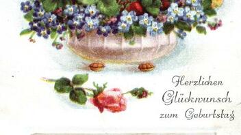 Eine farbenfrohe Geburtstagskarte aus dem Jahre 1934, die ein Wasserflugzeug über der Marineschule im Kieler Ortsteil Friedrichsort zeigt.