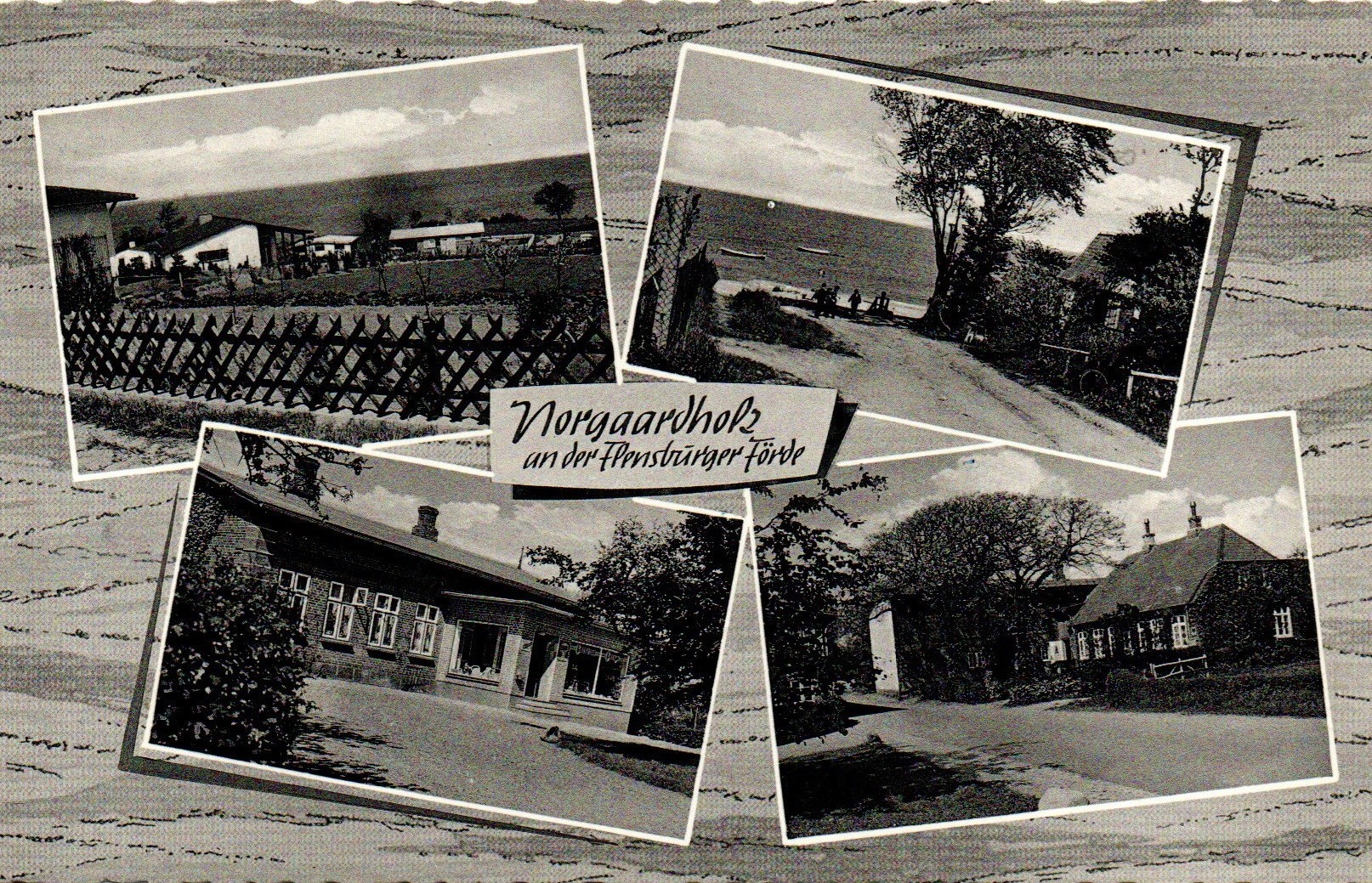 Die Beschriftung sagt nur Norgarrdholz an der Flensburger Förde, die einzelnen Bilder werden nicht erklärt. Immerhin unten links ist eindeutig der Dorfladen zu erkennen und oben rechts der Zugang zum Strand.
