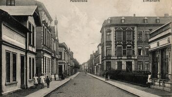 Als Motiv die Königstraße in Richtung Osten (also Richtung Bahnhof). Auf der rechten Straßenseite das Backsteingebäude hinter dem Haus mit dem hellen Erker war das kaiserliche Postamt. Auf der linken Seite das Wäsche-Geschäft von Konrad Drückhammer, dahinter zweigte ein Durchgang (Drückhammer Gang) zum Probstenfeld ab. Auch hier gab es kleine Geschäfte.