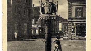heute mal wieder eine Ansichtskarte aus Schleswig-Holstein. Sie zeigt den Müllenhoff-Brunnen in Marne. Der Brunnen erinnert an den deutschen Germanisten Karl-Viktor Müllenhoff, der unter anderem eine Sammlung dithmarscher Sagen anlegte. Eine dieser Sagen diente als Motiv für den Brunnen. Dithmarschen würde wieder unabhängig, wenn eine verdorrte Linde mit kreuzweise gestellten Ästen wieder grünt und eine schwarze Elster mit fünf weißen Jungen in dieser Linde brütet.