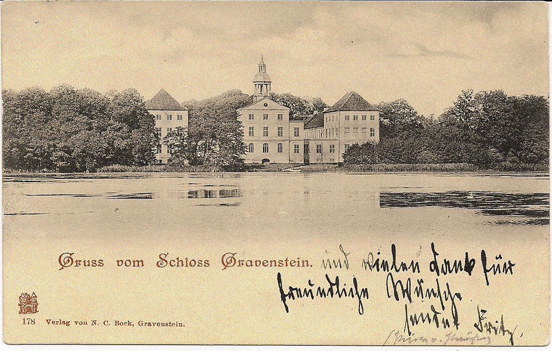 Ich zeige heute eine AK von Gravenstein / Gråsten aus dem Jahr 1899. Gravenstein / Gråsten liegt in Nordschleswig / Sønderjylland. Das abgebildete Schloss ist heute Sommerresidenz der dänischen Königsfamilie.