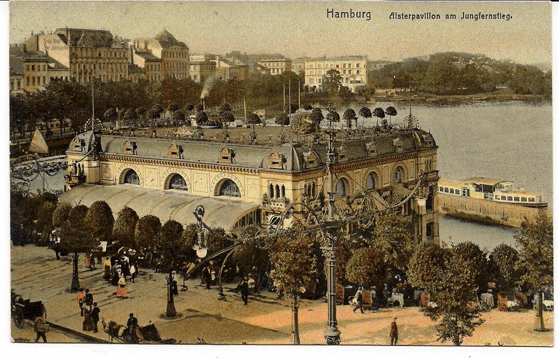 der Hamburger Jungfernstieg ist wohl eins der Hamburger Postkartenmotive. Es dürften hunderte verschiedene Ansichtskarten im Laufe der Jahrzehnte mit diesem Motiv aus allen möglichen Perspektiven entstanden sein. Hier mit folgendem Druckvermerk: 15 Chromo-Lichtdruck von Knachstedt & Näther Hamburg. Im Jahr 1907 nach Leipzig geschickt.