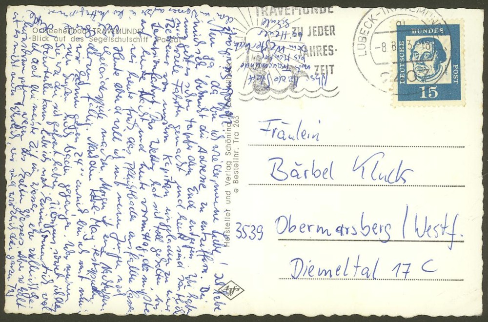 Heute eine recht moderne Karte mit Blick auf Travemünde; im Hintergrund ist das Segelschulschiff "Passat" zu sehen. Die Karte lief am 8.8.1963 von Lübeck-Travemünde nach Obermarsberg in Westfalen.