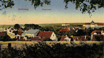 Es handelt sich um eine Karte, die wohl von der Michaelisallee in Richtung Friedrichsberg aufgenommen wurde. Am Bildrand rechts das Schloss Gottorf (Rückseite) links daneben im Hintergrund wohl der "Rote Elefant". So wurde im Volksmund das Gebäude der preussischen Provinzverwaltung spöttisch genannt. Architektonischer Ausdruck der Unterwerfung und Annektion Schleswig-Holsteins durch die Preussen. (Heute ist in dem Gebäude das Schleswig-Holsteinische Oberlandesgericht untergebracht).
