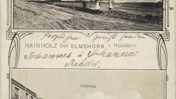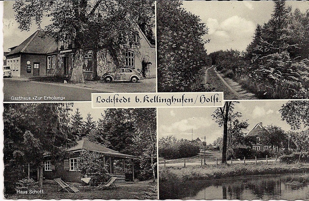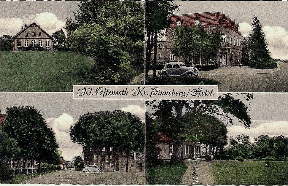 Wir sehen eine Mehrbildkarte mit verschiedenen Ansichten des Dorfes Hollingstedt in Dithmarschen. Im Bild unten links ein sehr zeittypischer VW-Käfer. Den Lieferwagen im Bild oben rechts kann ich leider nicht identifizieren. Die Motive werden bedauerlicherweise nicht erklärt, auch nicht auf der Rückseite.