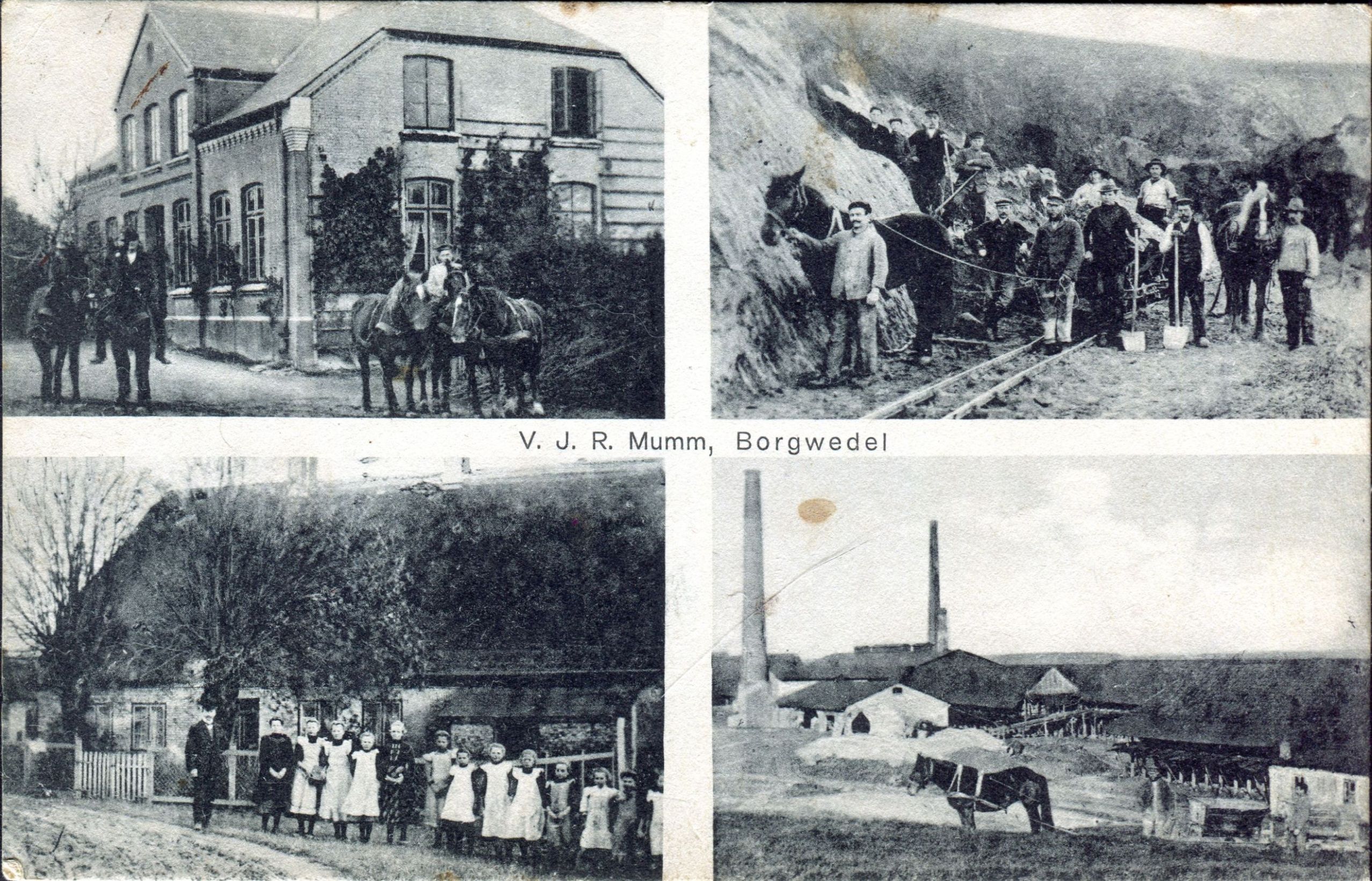 Bis 1956 befand sich in Borgwedel eine der zahlreichen Ziegeleien der Region (rechtes, unteres Bild der Karte). Eiszeitlich bedingte Tonvorkommen und die günstige Verkehrslage an der Schlei waren perfekte Voraussetzungen für einen derartigen Betrieb, beim rechten, oberen Bild ist vermutlich der Abbau bzw. Transport (von Pferden gezogene Loren) festgehalten.
