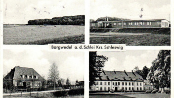 Bis 1956 befand sich in Borgwedel eine der zahlreichen Ziegeleien der Region (rechtes, unteres Bild der Karte). Eiszeitlich bedingte Tonvorkommen und die günstige Verkehrslage an der Schlei waren perfekte Voraussetzungen für einen derartigen Betrieb, beim rechten, oberen Bild ist vermutlich der Abbau bzw. Transport (von Pferden gezogene Loren) festgehalten.