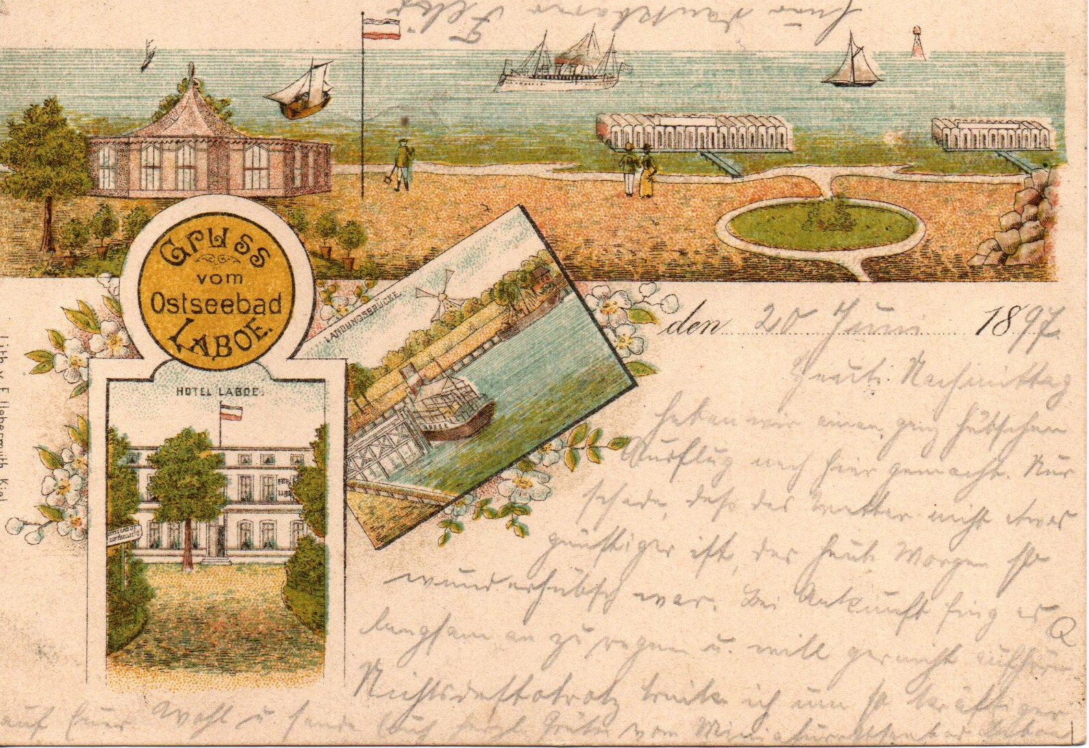 Sie Bilder zeigen verschiedene Ansichten, den Strand, das Hotel Laboe und den Schiffsanleger. Das Schiff auf der Förde soll wohl die Kaiseryacht Hohenzollern darstellen. Die Karte ist 1897 gelaufen.