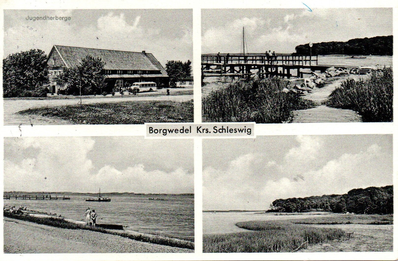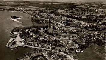 Als Motiv die Königstraße in Richtung Osten (also Richtung Bahnhof). Auf der rechten Straßenseite das Backsteingebäude hinter dem Haus mit dem hellen Erker war das kaiserliche Postamt. Auf der linken Seite das Wäsche-Geschäft von Konrad Drückhammer, dahinter zweigte ein Durchgang (Drückhammer Gang) zum Probstenfeld ab. Auch hier gab es kleine Geschäfte.