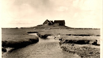Das Motiv zeigt eindeutig einen Hof auf einer Halligwarft mit einem Priel im Vordergrund. Ich vermute, es handelt sich um die Neuwarft auf der Hallig Nordstrandischmoor. Nordstrandischmoor ist wie die Inseln Nordstrand und Pellworm ein Überrest der 1634 in der Buchardiflut untergegangenen Insel Strand. Siehe auch wikipedia: https://de.wikipedia.org/wiki/Nordstrandischmoor