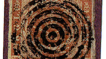 Type III: Ein Vierringstempel mit dickem Punkt, verwendet in Schleswig-Holstein. (Hier als abgenutztes Exemplar auf 4 Sk. Afa/Mi. 4, durch die Abnutzung erscheinen Ringe und Punkt noch dicker!)