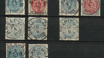 Ich zeige eine 4 Sk. Marke (Afa/Mi. 7) mit K1-Stempel Faaborg, eine 4 Öre Marke (Afa/Mi. 23) mit K1-Stempel Samsø und ein Paar der 20 Öre Marke Wappenausgabe (Afa/Mi. 36) mit einem schon stark abgenutzten K1-Stempel Marstall vom 8.1.1888 (Ablösung im Juli 1888 durch einen K1-Lapidarstempel).