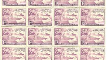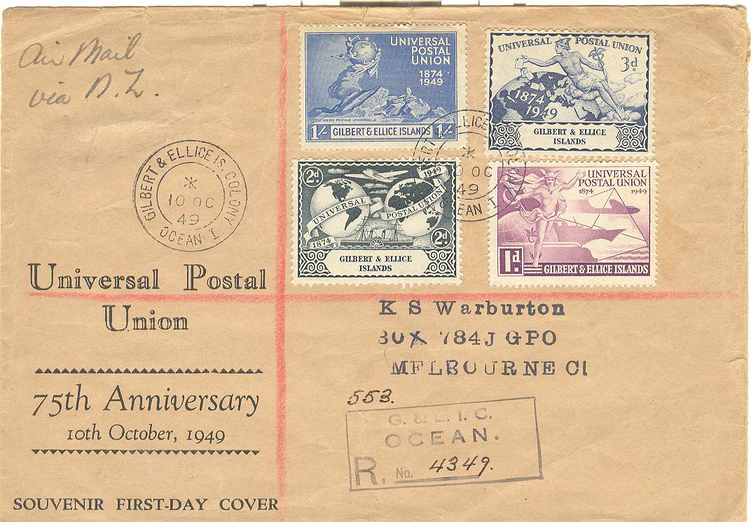 im Jahre 1949 wurde nicht nur Silberhochzeit im englischen Königshaus gefeiert. Auch der Weltpostverein (UPU) feierte den 75.Jahrestag der Gründung. Viele unabhängige Länder und Kolonien feierten dies mit der Ausgabe von Briefmarken und Briefmarkenserien. Auch die Gilbert und Elliceinseln reihten sich hier ein. Es wurden vier Einzelwerte (1d, 2d, 3d, 1/-) ausgegeben, die als Omnibusausgabe für die englischen Kolonien ausgelegt war. Verantwortlich für den Druck zeichneten wiederum zwei Druckereien die da wären Bradbury, Wilkinson & Co. (2d und 3d) sowie Waterlow (1d und 1/-). Bradbury, Wilkinson & Co. bediente sich dabei dem Stichtiefdruck (Markenbild) und Buchdruck (für den Kolonienamen). Gedruckt wurden die Marken in 120-er Bögen (2 Halbögen a 60 Marken) mit jeweils 5 Spalten und 12 Zeilen je Halbbogen. Die Perforation der 2d und 3d - Ausgaben beträgt 11 x 11 1/2. Die Firma Waterlow produzierte die 1d und 1/- - Ausgabe im Stichtiefdruck. Auch hier wurde das Markenbild und der Koloniename, Nominalwert auf getrennten Druckplatten erstellt und in einer Masterplatte vereint. Produziert wurden diese Ausgaben in 60-er Bögen (5 Spalten / 12 Zeilen). Die Perforation der 1d und 1/- - Ausgabe beträgt 13 1/2 x 14. Alle vier Ausgaben wurden auf Papier mit Wasserzeichen 2 gedruckt. Die einzelnen Marken wurden in folgenden Mengen gedruckt (Quelle: Philatelic Handbook of the Gilbert & Ellice Islands):